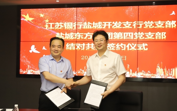 簽約儀式上,鹽城東方集團第四黨支部書記王成林與江蘇銀行鹽城開發支行黨支部書記史雪峰共同簽訂了黨建共建協議書。
