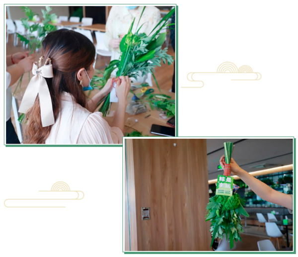 當(dāng)巧手與花材不期而遇……不知不覺中,零散的花材變成了一束束的艾草花束,片片綠葉映襯出傳統(tǒng)佳節(jié)的悠悠思緒,絲絲繩結(jié)纏繞出節(jié)日的美好祝福。