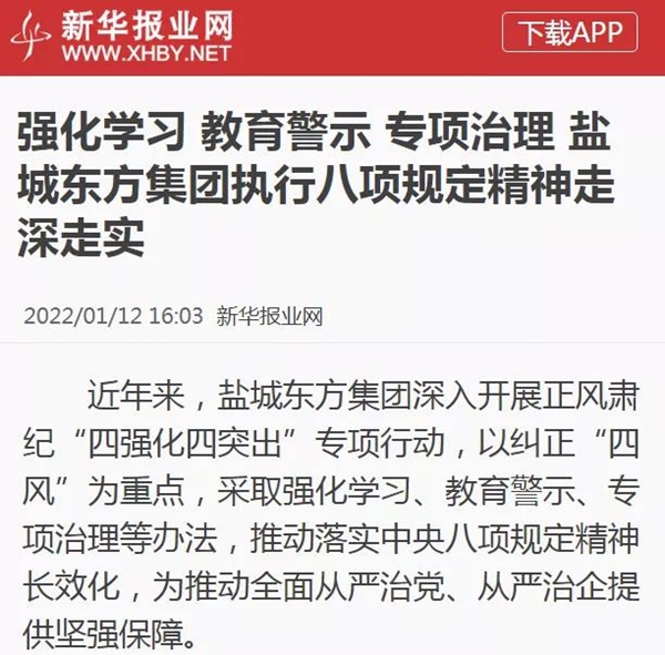 1月12日,新華報(bào)業(yè)網(wǎng)關(guān)注報(bào)道鹽城東方集團(tuán)落實(shí)中央八項(xiàng)規(guī)定精神長(zhǎng)效化重要舉措。