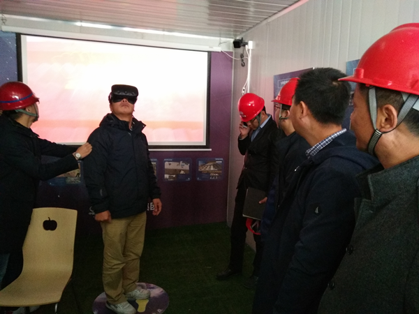 圖為觀摩人員參觀項目現場BIM技術運用中的3D打印技術和現場危險源VR展示場景。