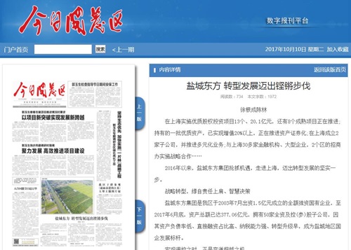鹽城東方集團是國家級鹽城經(jīng)濟技術(shù)開發(fā)區(qū)于2003年7月出資1.5億元成立的全額獨資國有企業(yè),發(fā)展至2017年6月底,資產(chǎn)總額已達377.06億元、擁有50家全資及控(參)股子公司,因其資產(chǎn)負債率低、直接融資占比高、納稅能力強、轉(zhuǎn)型升級早,成為鹽城地區(qū)國企發(fā)展標(biāo)桿,在蘇北乃至全省、上海的相關(guān)地區(qū)也產(chǎn)生了一定的影響。