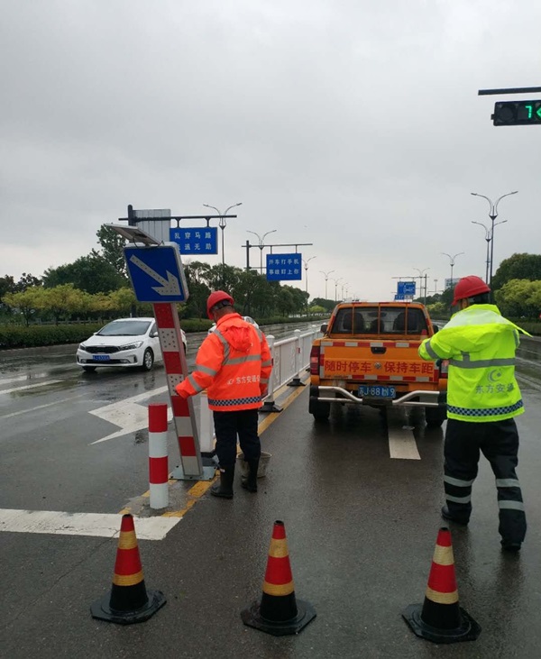 安通公司為保證開發區道路通暢,加班修復因強風暴雨而造成的護欄倒伏、爆閃燈損壞等情況。22日下午修復了五臺山路、希望大道等路段的護欄。當天晚上所有員工加班加點值班巡查,一有發現損壞,及時修復。所有員工奮戰到次日凌晨,截至目前,仍繼續巡查開發區所有路段。