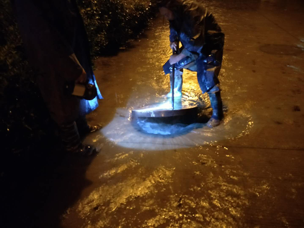 圖為東方物業人員巡查發現積水嚴重,打開井蓋排水
