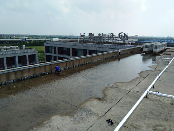 圖為東方物業人員清理屋頂積水,疏通排水管