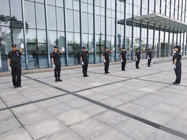 圖為鹽城東方物業(yè)公司東方科技城項(xiàng)目秩序維護(hù)部晨練交通手勢(shì)