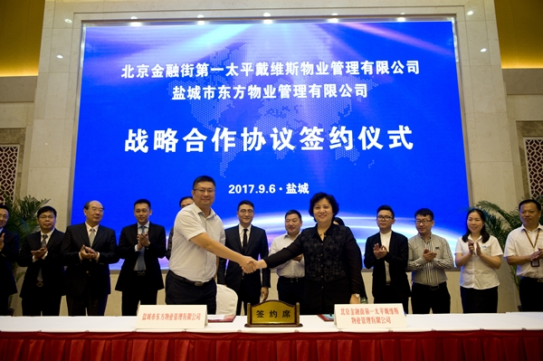 圖為鹽城東方物業(yè)管理有限公司與北京金融街第一太平戴維斯物業(yè)管理有限公司簽約戰(zhàn)略合作協(xié)議