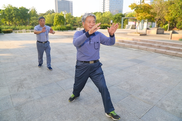 ▲居民在公園廣場(chǎng)上打太極拳