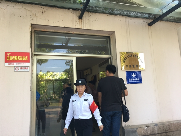 公園內(nèi)一塊寫(xiě)有“志愿者服務(wù)站”字樣的紅色指示牌引入注目,走進(jìn)里面一看,麻雀雖小五臟俱全。據(jù)東方園林工程公司公園管理處主任陳浩介紹,為了方便群眾,這里向市民免費(fèi)提供各項(xiàng)服務(wù),備有藥品、創(chuàng)可貼、針線包、雨傘等應(yīng)急物品。保安員韓粉干在這里工作十年了,她翻開(kāi)每日工作日志,介紹說(shuō):“維護(hù)公園秩序重在細(xì)節(jié),大大小小的園內(nèi)事都記錄在內(nèi),我們始終將守護(hù)游客安全放在第一位。”