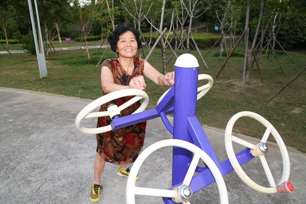 ▲居民在公園公共健身器材處鍛煉