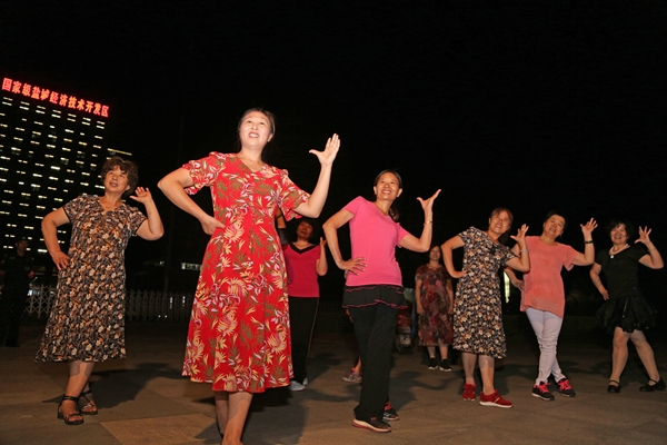 ▲夜晚居民在公園廣場(chǎng)上跳廣場(chǎng)舞