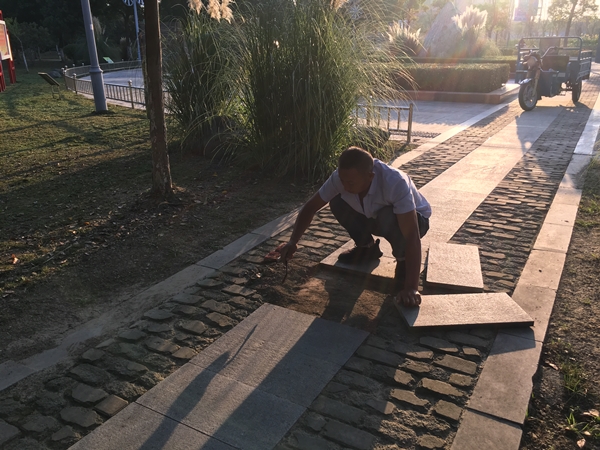 ▲公園管理員巡查并維修東方公園石板路