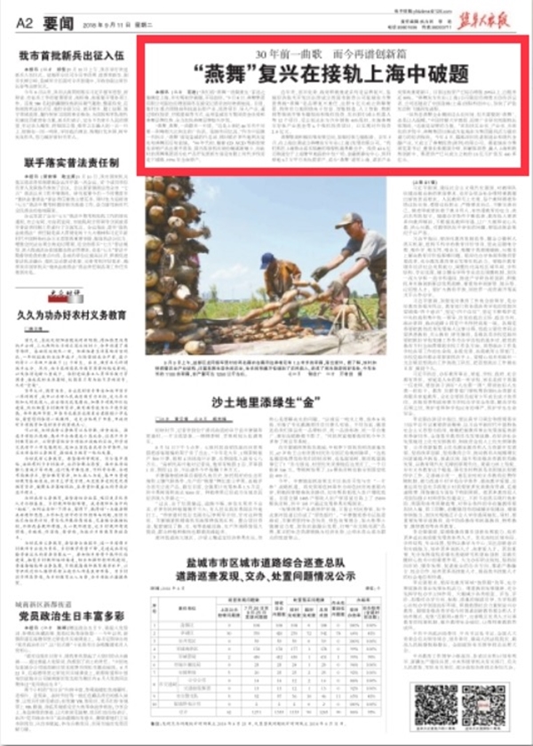 《鹽阜大眾報》今日二版頭條推出“30年前一曲歌 而今再譜創(chuàng)新篇——'燕舞'復興在接軌上海中破題” http://yfdzb.ycnews.cn/yfdz/20180911/html/page_01_content_003.htm(《鹽阜大眾報》電子版)——