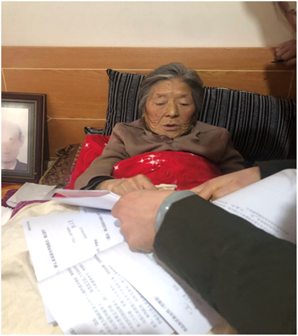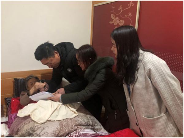 根據制度規定,不動產登記前期手續需本人親自帶上相關材料到場辦理,但耿漢英老人生病臥床,無法到置業營銷部進行面簽。該部門了解這一情況后,立即安排兩名工作人員帶上商品房買賣合同、詢問筆錄等相關資料開展上門服務,見證當事人簽字按章,并進行拍照留檔,圓滿完成了房屋登記辦理前期手續,為老人家庭排憂解難。