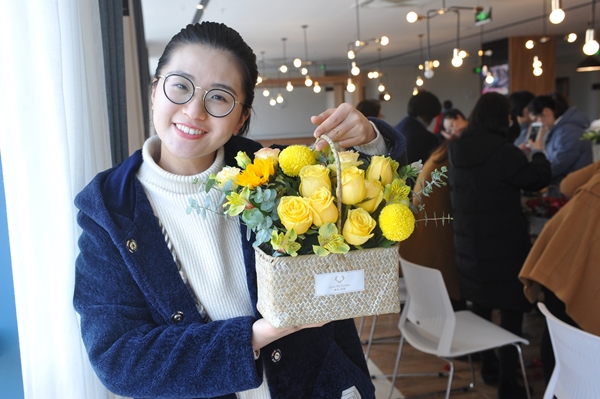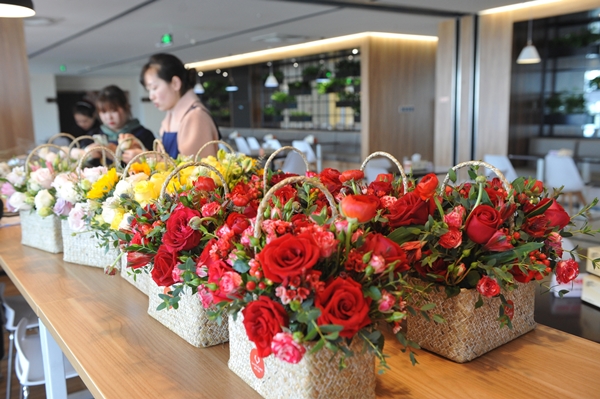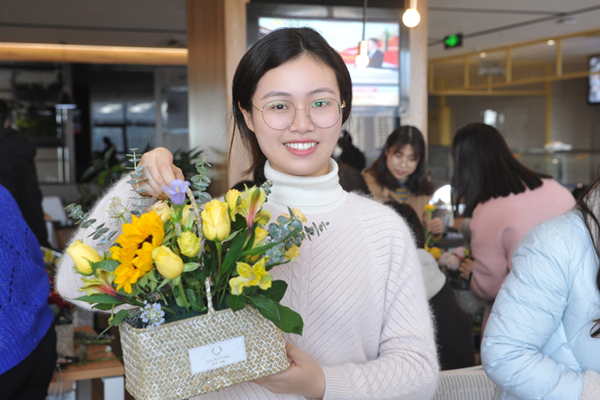 活動現場花香四溢,女員工們手捧鮮花,仔細地裝點起自己的花束,表情專注,鮮花被一雙雙靈巧的手精心修剪后放入花籃內,呈現出最動人的姿態,創作出了一個個造型優美、花團錦簇、色彩活潑、穿插和諧的插花作品,現場氣氛溫馨浪漫,歡聲笑語響成一片。