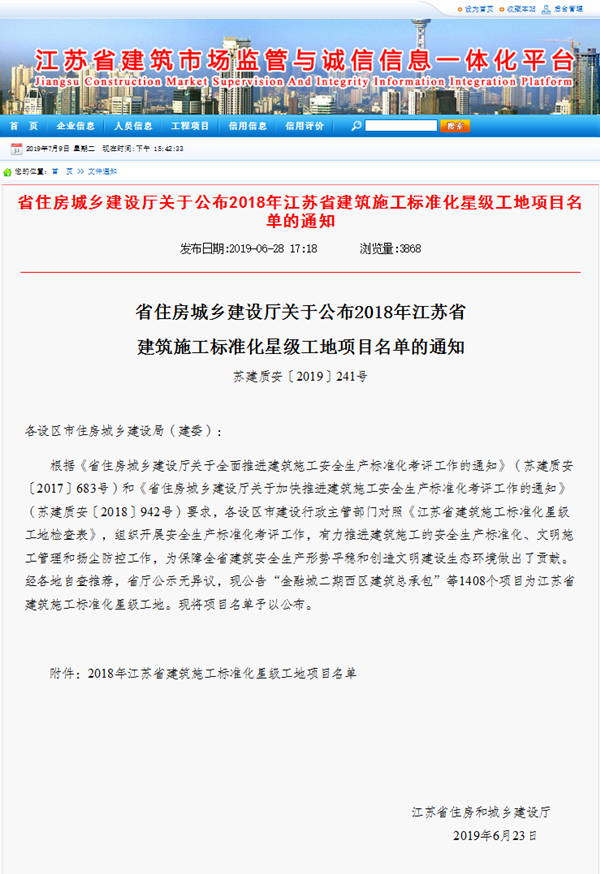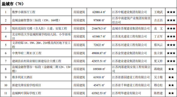 日前,省住建廳公布了2018年江蘇省建筑施工標準化星級工地項目名單,在鹽城經濟技術開發區上榜的8項工程項目中,鹽城東方集團承建項目占據7項,其中悅欣花園住宅樓(含人防)土建、安裝工程和北師大鹽城附校幼兒園、小學部兩個項目更是榮獲三星級施工標準化工地,成為名副其實的工程建設“大贏家”。