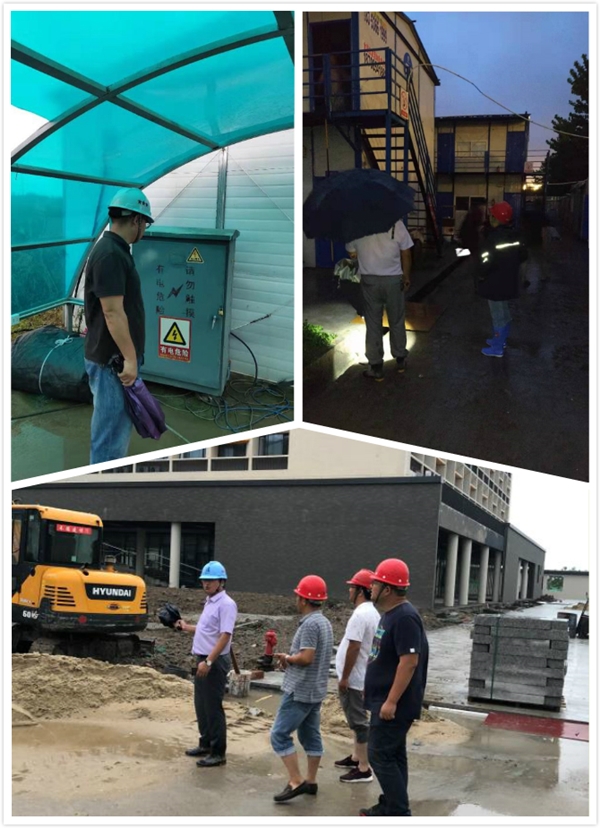 臺風來臨前,東方集團所屬工程項目2臺塔吊全部放開回旋裝置,136臺吊籃全部停到底層,168間活動板房全部予以加固,所有大型設備全部斷電。按照防汛值日所有建設項目均有人員連夜值班巡查,10日夜間集團工程管理部分別對北師大初高中、東方之洲、悅欣花園、未來科技城4個項目的施工現場防臺風落實工作進行了突擊檢查,各工地項目部大門關閉,活動房內工人全部撤離,施工現場電源切斷,工程條線各建設項目值班人員均在崗在位。