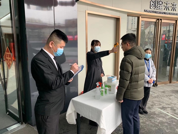 2月10日,是上海市市政府發布通知的節后企業復工首日。為營造安全的辦公環境,金融街(靜安)中心加強對復工企業人員的進出管控,使用一米欄將大堂入口隔離排隊區域,隔離登記區域并放置登記及體溫測量工具,在現場保安及客服人員的指引下,員工體溫測量及登記工作有序進行。對所管轄的項目的電梯轎廂里放置了一次性餐巾紙供使用電梯的業戶使用,避免間接性接觸,對全樓層進行全面消殺,全力守護復工人員的生命安全和健康。