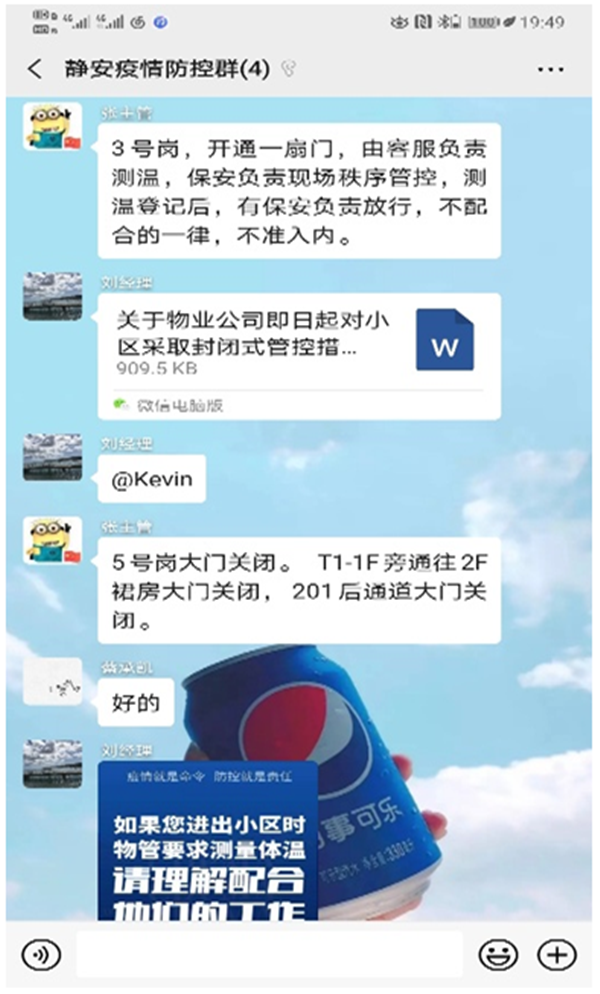 “緊跟權威信息、科學籌備、聯防聯控”是上級對本項目此次疫情工作的指示要求。為了確保信息傳達的及時性,除了要求各部門手機保持24小時暢通外,金融街(靜安)中心項目針對此次疫情建立“靜安疫情防控群”微信群,保持實時溝通及傳達,并與曹家渡街道辦、曹家渡疫情防控小組、房管局等政府部門人員保持實時溝通。先后落實了“曹家渡街道關于樓宇疫情防控工作要求” “靜安區復工企業申請” “房管局物業小區防疫自查” “企業在滬/回滬人員信息情況”等重點工作統計及落實;為強化項目管控措施,金融街物業管理處擬訂并落實實施《金融街(靜安)中心即日起試試封閉式管理方案》。此方案的執行使疫情的防控措施得到完善,為疫情的防控增加了一層保障。