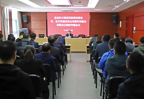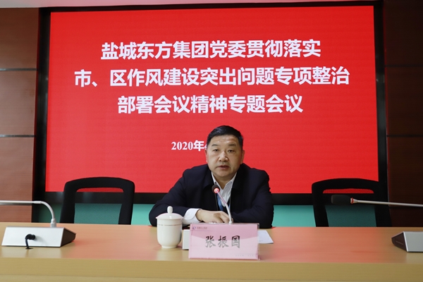 4月10日下午,鹽城東方集團黨委召開了貫徹落實市、區作風建設突出問題專項整治部署會議精神專題會議。集團黨委書記、董事長張振國主持會議,集團在鹽領導班子,集團公司、東方置業、東方市政、東進控股、永泰投資公司中層以上,其他子公司經營層人員參加了會議。