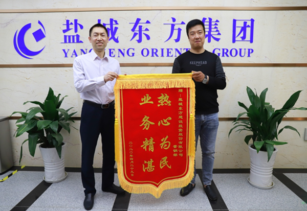 近日,鹽城東方建設投資股份有限公司營銷部收到一面康欣花園居民送來的繡有“熱心為民,業務精湛”的錦旗。“真的沒想到這么快就能拿到房產證,太開心了!感謝工作人員的熱心服務”, 康欣花園業主陳麗由衷地說道。