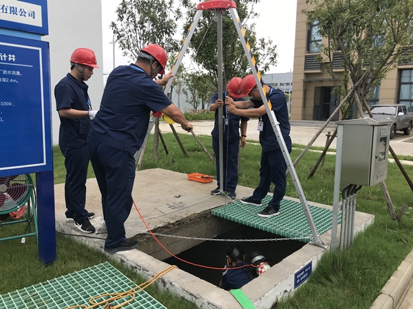 演練情景模擬時,該公司員工按正常審批流程進入進水流量計井作業,因硫化氫中毒作業人員昏倒在井內,現場作業組將事故情況立即上報?,F場總指揮王軍立即啟動預案,同時召集救援組趕赴現場進行搶救,地面救援組安置好救援三腳架并將救援繩放入井內,下井救援人員王權權佩戴正壓式空氣呼吸器等防護用品進入井內,給“受傷人員”系好救援繩并拉出井外,由地面救援組張成杰對傷者進行了心肺復蘇。經過半個小時緊張有序的演練,“傷員”得到有效救治,事故得到有效處置。