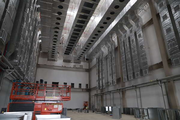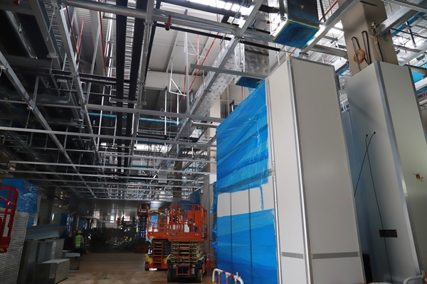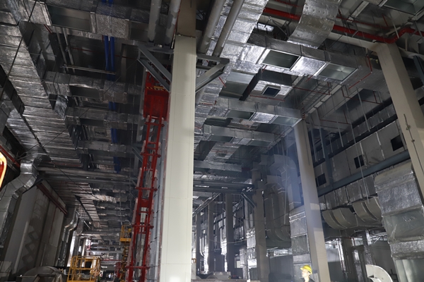在總承包中鐵建工集團建筑安裝有限公司的現(xiàn)場負責人的引導(dǎo)下,東方集團一行人參觀學(xué)習了該項目的電極棟、組裝棟、活性棟等主生產(chǎn)廠房以及其他輔助用房。項目負責人就各觀摩區(qū)域的亮點向觀摩人員作一一介紹,該工程的建筑形式為鋼結(jié)構(gòu)建筑,以電極棟一層為例,天花板上部共有21個系統(tǒng)機電管線,管線布置及其復(fù)雜,為了解決管線碰撞問題,項目指揮部開展BIM管線綜合深化設(shè)計。項目部合理整潔衛(wèi)生的施工場地、醒目的標語標識牌、規(guī)范的施工工藝、文明安全的施工氛圍,給前來觀摩的人員留下深刻的印象。