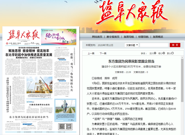 2020年6月28日《新華日報》第4版:“一線視點”刊發《鹽城東方集團展國企擔當,讓5萬余被征地群眾“安居”》。