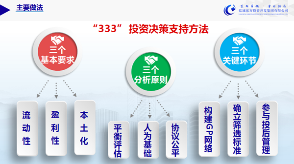 鹽城東方集團副總經理許榮偉向大會評委匯報了鹽城東方通過創新投資理念成功投資中微半導體、拓荊科技、京東數科、瀾起科技等優質項目獲得豐厚回報的經驗總結。主要做法歸納為“333”投資決策支持方法:3個基本要求、3個分析原則和全周期管理的3個關鍵環節。3個基本要求,即流動性要求、盈利性要求和本土化要求;3個分析原則,即平衡評估、人為基礎、協議公平;全周期管理的3個關鍵環節:即構建GP網絡、確立篩選標準、構建跨組織關系對投資進行管理。立足鹽城經開區、接軌上海大力推進股權投資,積極探索“投招基金”“基金招投”新模式,努力實現服務園區招商和股權投資共贏。