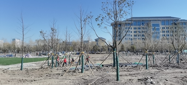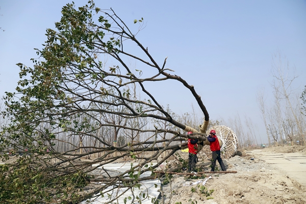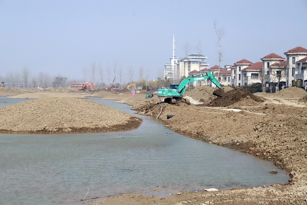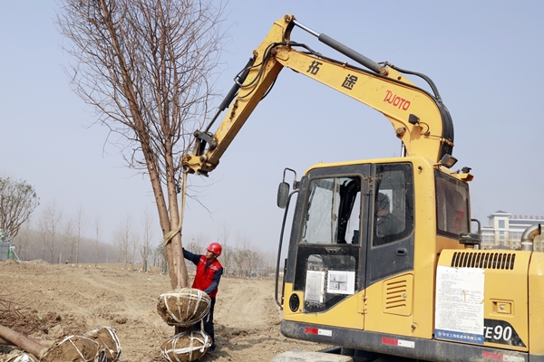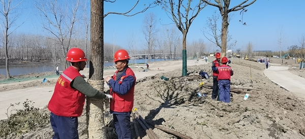 2月23日,鹽城經(jīng)濟(jì)技術(shù)開發(fā)區(qū)新都路南側(cè)、通榆河?xùn)|側(cè),在通往鹽瀆路北、天山路西側(cè)的地塊中,都有星星點(diǎn)點(diǎn)的穿著東方園林熒光橙色背心勞作的身影。總長(zhǎng)1.33千米的作業(yè)線上,工作人員正在指揮吊車,將落羽杉移到指定的種植點(diǎn);現(xiàn)場(chǎng)地形平整、河道開挖初步成型,已卸車的喬木整齊碼放在一起;工人們忙著為待栽植的樹木修剪樹枝,用藤條綁扎樹干根部。據(jù)項(xiàng)目現(xiàn)場(chǎng)負(fù)責(zé)人孫龍介紹,該項(xiàng)目需要栽植各類樹木約4700棵,計(jì)劃3月25完成。現(xiàn)場(chǎng)近180人開工,同時(shí)配備2輛吊車、6臺(tái)挖機(jī)、1輛水車全天候用于場(chǎng)地平整、裝卸樹木和澆灌苗木。截至目前,東方團(tuán)林施工團(tuán)隊(duì)已經(jīng)栽植樹木500多棵,包含香樟、廣玉蘭、櫸樹、銀杏、落羽杉等品種。