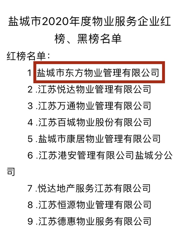 此次信用等級評定是根據《鹽城市物業服務企業信用評價管理暫行辦法》,結合各縣(市、區)物業行政主管部門對物業公司的監管評價和“鹽城市物業服務行業綜合監管平臺”上物業服務企業信用信息,開展年度鹽城市物業服務企業信用綜合評價工作,通過對企業的信用記錄、企業素質、經營水平、獲得榮譽等進行客觀、科學、公正的分析研究,評選出A級信用企業10家。市住建局公布的鹽城市2020年度物業服務企業“紅黑榜”中,9家物業公司列入“紅榜”,13家物業公司進入“黑榜”。 在本次考評結果中,東方物業公司光榮上榜,是對其物業服務品質的肯定。