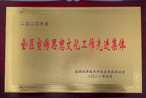 2021年4月10日,在鹽城經(jīng)濟(jì)技術(shù)開發(fā)區(qū)宣傳思想文化工作會(huì)上,鹽城東方集團(tuán)獲得2020年度“全區(qū)宣傳思想文化工作先進(jìn)集體”榮譽(yù)稱號(hào)。