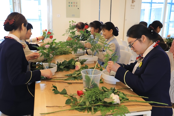在花藝老師的演示和講解下,女職工們現學現用,精心構思,悉心修剪,相互交流插花心得,享受花藝帶來的輕松與歡樂,將一捧鮮花一個花盆,變成了一件件清雅別致的花藝作品。大家還根據主題為作品起名“清正廉潔” “廉由心生” “清風徐來”等,并與自己的花藝作品合影留念。