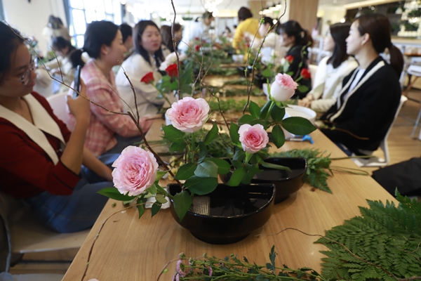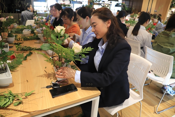 活動開始后,花藝老師為大家介紹日式插花的基礎知識,展示了一些經典日式插花作品,同時還教授了日式插花的方法和各種小技巧。日式插花講究的是“空、寂、靜”,用最適合的花材體現花、葉、器的線條之美,以簡為榮,正符合了東方集團清風正氣的文化底蘊。