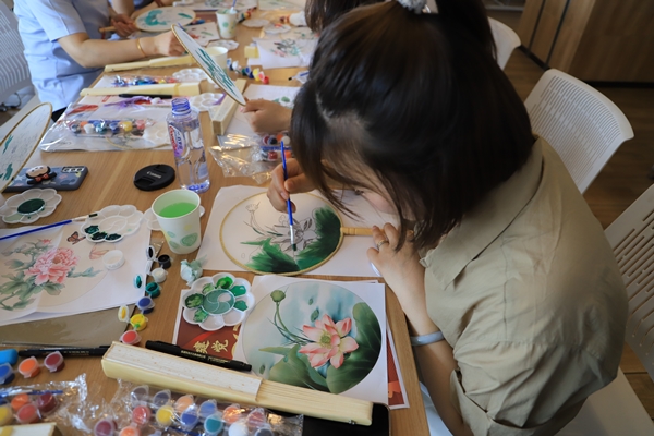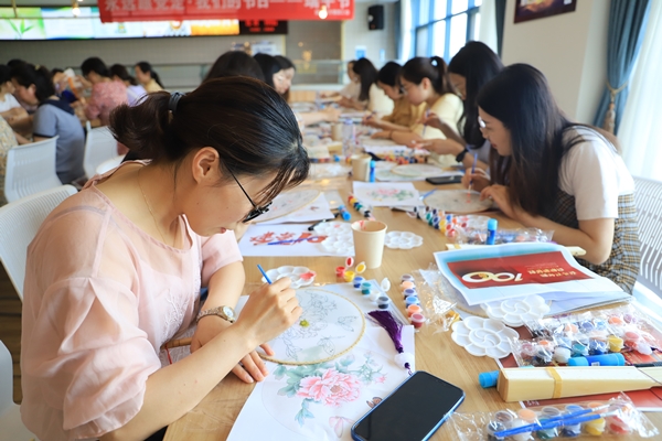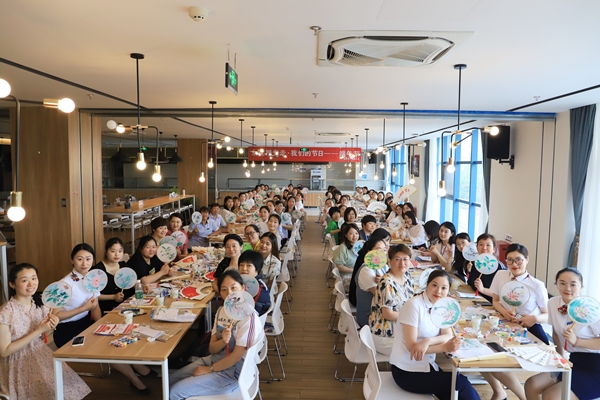 扇面繪制完成后,員工們手持團扇合影留念,一張張笑臉與團扇作品輝映,留下了美好的影像。