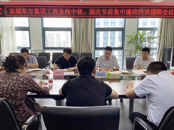 9月13日,鹽城東方集團工程條線在1115會議室組織召開中秋、國慶節前廉政約談提醒會議。集團黨委委員、副總經理王成林主持會議并對工程條線人員進行節前集中廉政約談提醒。集團黨委委員、紀委書記華小軍就工程條線人員廉潔過節提具體要求。集團工程部、招標部、審計部、重點工程負責人及有關人員等20余人參加會議。