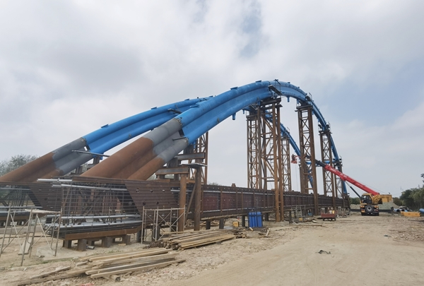 德喜大橋項目部以使命必達的決心,全力以赴加快項目建設,加派施工人員多作業面同步推進,采用優化工序、穿插作業,實行兩班倒24小時施工,確保工程質量及施工安全,全力加快建設速度。截至目前,該項目已完成橋梁全部下部結構、接線底層瀝青攤鋪、主橋上部鋼結構拼裝、河西預制板梁吊裝。當前正在進行河東現澆箱梁第八聯支架搭設、主橋上部結構、河西預制板梁護欄施工。