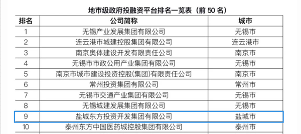 鹽城東方集團進入江蘇省地級市政府融資平臺榜單第九位,成為鹽城市唯一一家躋身該榜單前十的國企!“鹽城經開區發布”公眾號今日頭條濃情點贊!