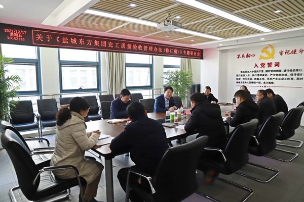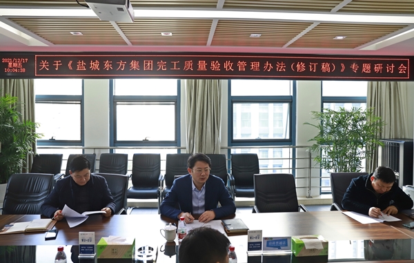 12月17日,在鹽城東方集團1115會議室,集團黨委委員、副總經理王成林牽頭召開《鹽城東方集團完工質量驗收管理辦法(修訂稿)》專題研討會。集團工程管理部、招標部、審計部、東方建設、東方市政、東方地產等部門負責同志參加研討。