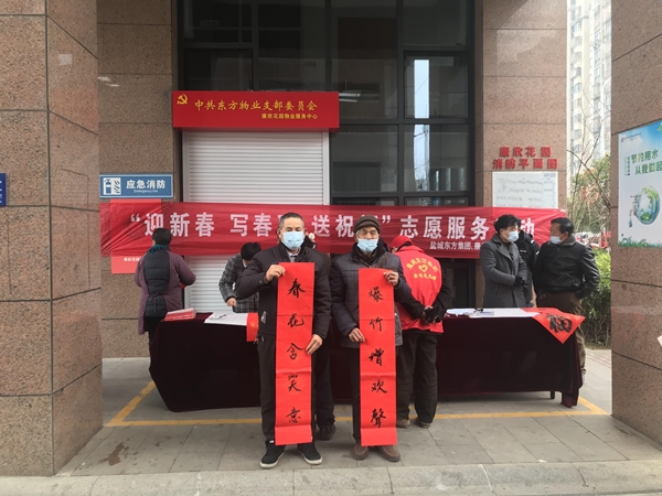 春節臨近,為弘揚傳統文化,豐富群眾的文化生活,進一步將“我為群眾辦實事”落到實處,1月26日,鹽城東方集團聯合康欣社區、華夏銀行,組織書法愛好者,走進鹽城經開區康欣花園,開展 “迎新春 寫春聯 送祝福“志愿服務活動,為居民們送去新春祝福。