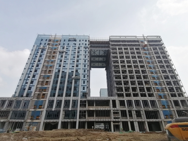 來到未來科技城北區現場,工人們戴著安全帽和口罩,腰系安全帶,加緊各項施工作業,現場不時響起“鐺鐺”聲。在施工區域,噴淋、霧炮等作業和施工同步進行。據了解,未來科技城北區項目總占地面積約59畝,總建筑面積近11萬平方米,建設內容包含2號樓和5號樓兩棟雙子樓、地下室及附屬工程,其中2號樓為研發辦公用房,5號樓為服務型公寓及配套商業。目前,該項目主體結構已通過驗收,正在進行外幕墻裝飾工程、室內精裝修工程、機電安裝工程、室外配套工程施工作業。