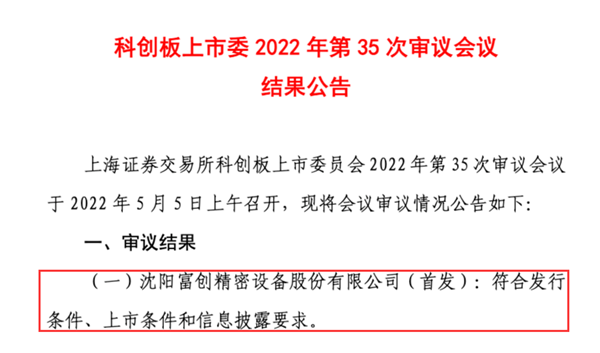 5月5日,上海證券交易所科創板上市委員會2022年第35次審議會議結果公告顯示,鹽城東方集團參投的沈陽富創精密設備股份有限公司(以下簡稱“富創精密”)的科創板首發申請獲通過。