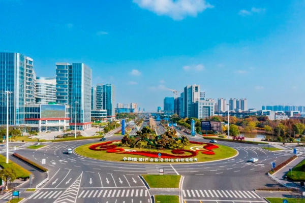 初冬正午,暖意融融。從新都路與希望大道交匯處交通環島往東看,在“如意牡丹”綠雕和中韓雙語的“中韓(鹽城)產業園”立體字掩映下,不遠處的未來科技城“科技藍”群樓愈發顯得熠熠生輝。