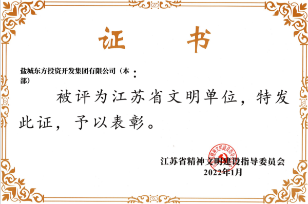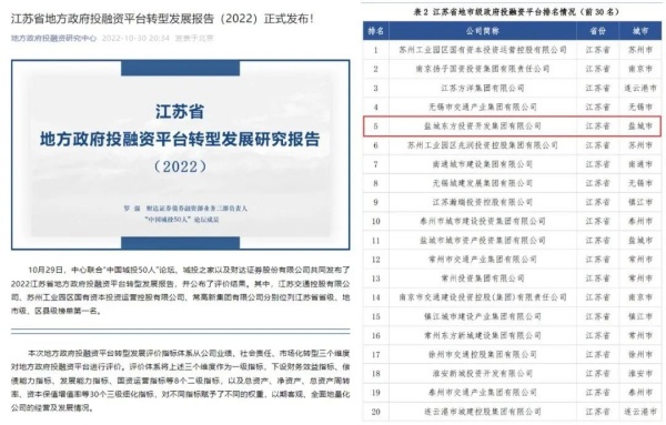 2022年10月30日,《江蘇省地方政府投融資平臺轉型發展報告(2022)》發布:在全省包括南京、蘇州、無錫在內的480家地市級城投公司中,鹽城東方集團轉型業績名列第五,較去年躍升四個位次,連續兩年鹽城唯一躋身全省前十。