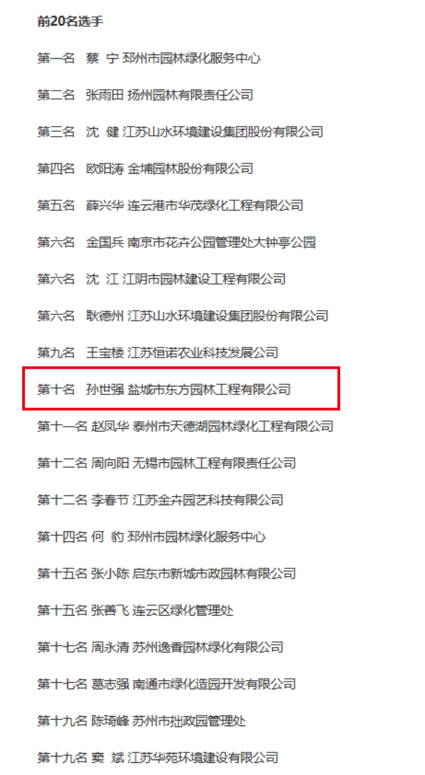近日,由江蘇省住房城鄉建設廳、省總工會、省教育廳聯合主辦,省人力資源社會保障廳指導的2023年度江蘇省百萬城鄉建設職工職業技能競賽“山水杯”綠化工決賽圓滿落幕。來自全省13個市的65名選手同臺競技,鹽城東方集團旗下鹽城市東方園林工程有限公司孫世強取得第十名的好成績,也是我市參賽選手唯一進入前20強接受表彰的代表。