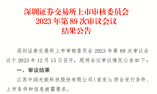 今天,深圳證券交易所創業板上市委員會發布公告:江蘇中潤光能科技股份有限公司(以下簡稱“中潤光能”)的首次公開發行股票申請符合發行條件、上市條件和信息披露要求。