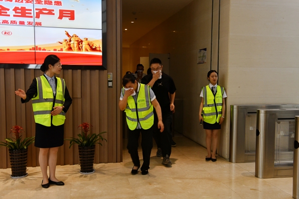 上午十點整,演練正式開始,集團大樓六樓發現火情,消防廣播,聲光警報等響起,安保巡邏人員、微型消防站救火隊員、電梯維保單位以及傷員救援組按照既定演練流程,迅速分時點到達任務點位,分別完成初期火災救援、停用電梯、傷員救助以及大樓內人員應急疏散撤離任務。