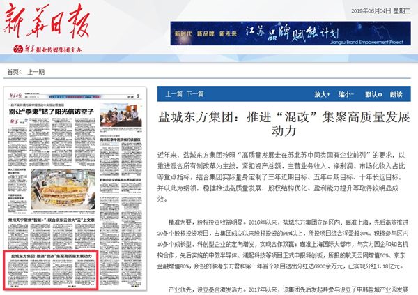 6月4日,《新華日報》在A7版倒頭條位置,以《鹽城東方集團:推進“混改”集聚高質(zhì)量發(fā)展動力》為題,聚焦東方集團混合所有制改革的做法,為東方集團高質(zhì)量發(fā)展取得的豐碩成果點贊。