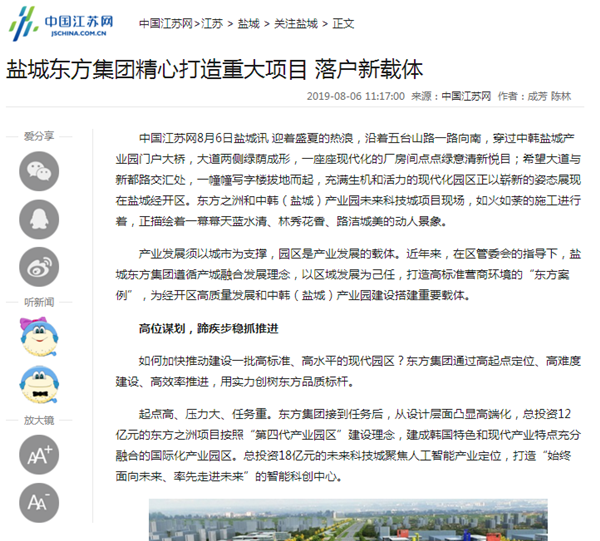 8月6日,中國江蘇網以《鹽城東方集團精心打造重大項目落戶新載體》為題,介紹鹽城東方集團遵循產城融合發展理念,以區域發展為己任,打造高標準營商環境的“東方案例”。
