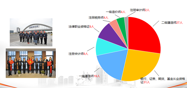 突破地處蘇北的區位劣勢,瞄準“985、211”相關知名高校,以美好的發展前景吸引重慶大學、武漢大學、蘭州大學等名校16位人才加盟;立足專業對口、實用通用原則,公開選聘東南大學、對外經貿大學、河海大學、蘇州大學等知名高校的工程建設、招商引資、市場分析、對外投資、財務管理、風險防控等方面29位高技能人才。目前,集團擁有注冊會計師9名、注冊稅務師4人、注冊審計師2人,一級造價師4人、一級建造師19人、二級建造師27人,擁有銀行、證券、期貨、基金等從業資格證31人,持有法律職業資格證9人。