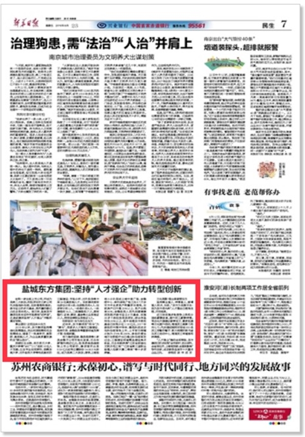 8月23日,《新華日報》A7版再度聚焦鹽城東方集團,以《鹽城東方集團:堅持人才強企 助力轉型創新》為題,重點介紹了東方集團在人才創新驅動方面的做法。